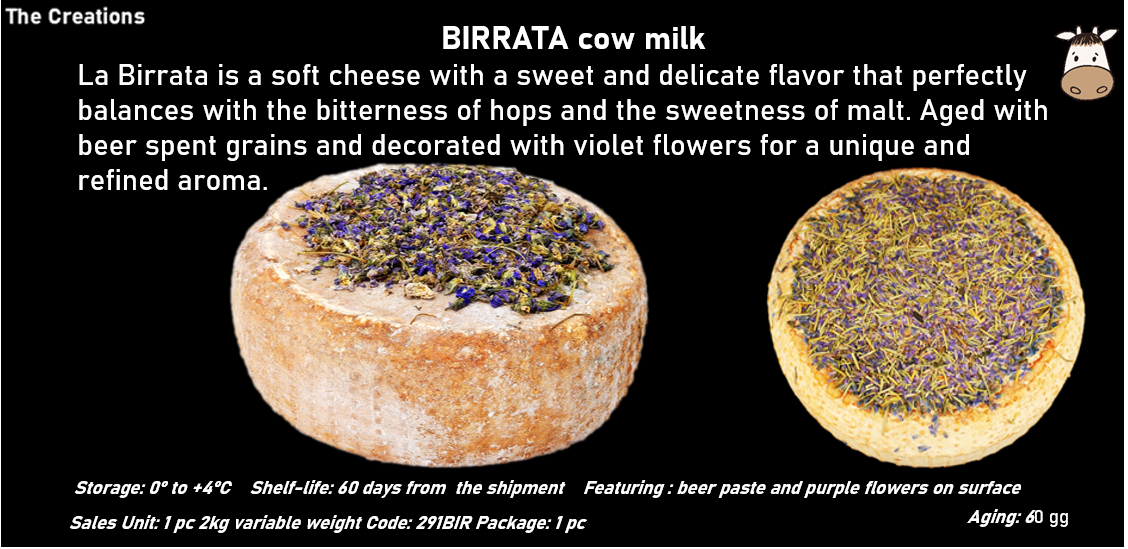 La Birrata è un formaggio tenero dal gusto dolce e delicato che si equilibra perfettamente con l'amaro del luppolo e la dolcezza del malto. Affinato con trebbie di birra e decorato con fiori di viola per un aroma unico e raffinato.